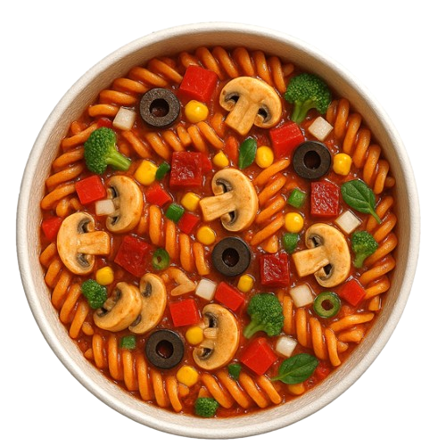 Enjoy a burst of freshness with our Vegetarian Delight Pasta, crafted for veggie lovers who crave flavour and balance. This vibrant bowl features al dente fusilli pasta coated in a tangy tomato sauce, blended with sautéed mushrooms, olives, peppers, broccoli, corn, and basil. Every bite offers a perfect harmony of textures — from the crunch of vegetables to the smoothness of the sauce.